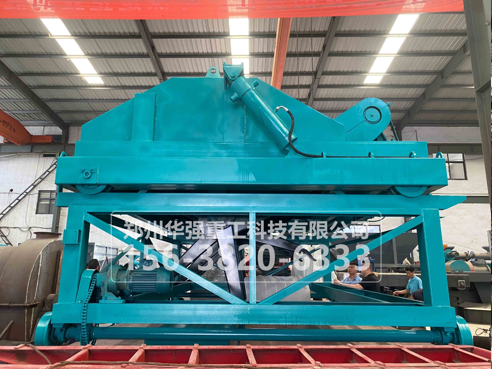 堆肥發(fā)酵翻堆機為智能化自動控制發(fā)酵物料的翻堆過程,在縱、橫向行走機構的作用下,與池底成45度夾角的多齒板式結構輸送機在驅動裝置的牽引下,刮板將發(fā)酵物料連續(xù)漸進的抄起并沿池底輸送至點后拋落,使其重新成堆并產生4米的位移,從而形成了一種連續(xù)的好氧發(fā)酵過程。
